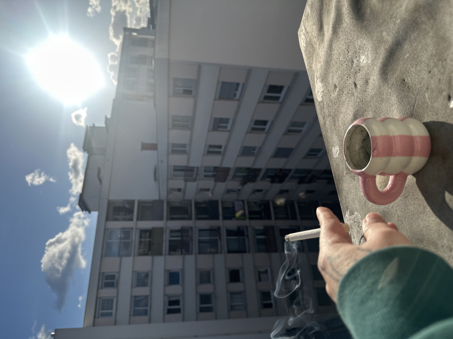 The image depicts an elevated outdoor scene in Saint-Ouen-sur-Seine, France, under a bright, sunny sky with scattered cumulus clouds. In the foreground, a left hand, clad in a teal long-sleeved garment, holds a lit cigarette between its index and middle fingers, emitting visible smoke. To the right, on a weathered, light grey concrete ledge, rests a small, white ceramic mug featuring several pink horizontal stripes and a matching pink handle. The interior of the mug appears dark. The background consists of multiple multi-story residential apartment buildings, predominantly light-colored, with numerous windows and balconies, suggesting a dense urban housing environment. The sun is prominently visible in the upper-right quadrant, generating strong light and casting defined shadows across the scene.