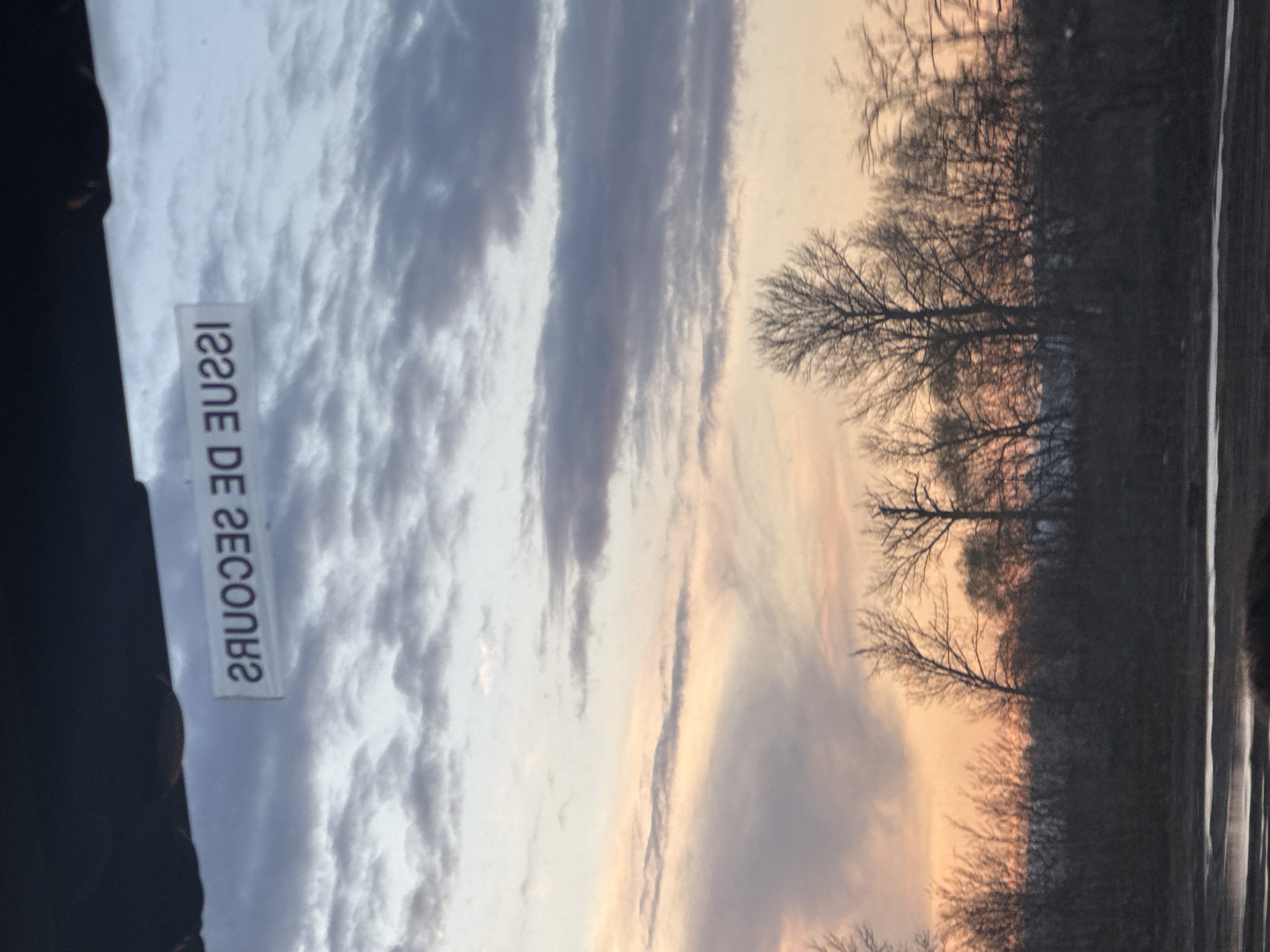 A photograph, rotated 90 degrees counter-clockwise, shows a landscape with trees at right and a cloudy sky. The sky transitions from blue-grey clouds on the left to a pale orange-yellow glow near the horizon, where the trees are located. The trees appear mostly bare of leaves, suggesting either a late fall or early spring scene. A dark, possibly solid object is visible in the lower-left corner. Attached to the object is a sticker with text, which is rotated. The sticker says "Issue de secours". There is no information to indicate that this image was taken in Yana, Bulgaria.