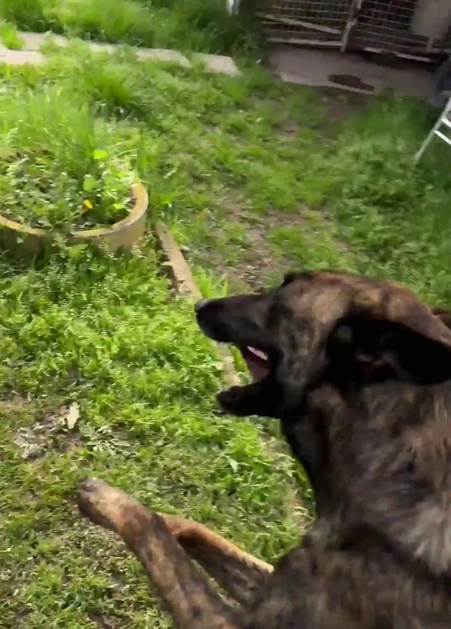 medium-sized dog with a brindle coat running on a grassy lawn. A person in work pants and boots is standing nearby. The dog runs around energetically, looking at the camera with its tongue out, and then sits and pants happily. The lawn is green with scattered dandelions. There is a potted plant and various pieces of debris visible in the background.