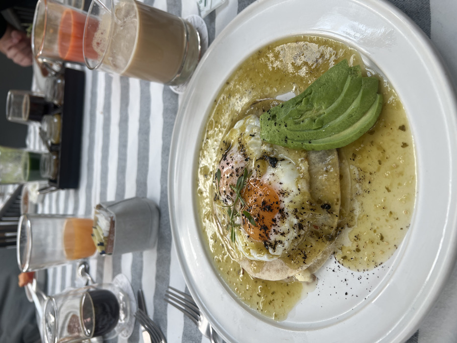 A plate of huevos rancheros features two fried eggs atop tortillas, smothered in green sauce and garnished with avocado slices. A sprig of herbs adds visual appeal. Nearby, a variety of beverages in glasses includes coffee, juice, and several smaller glasses of various drinks displayed in a rack. Silverware rests beside the plate on a striped tablecloth.