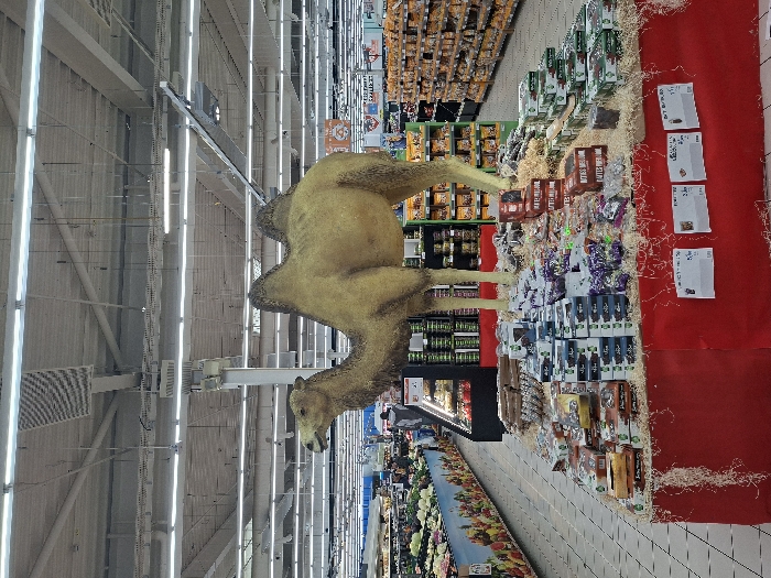 This image depicts the interior of a brightly lit supermarket located in Foetz, Luxembourg. The central focus is a large, tan-colored, two-humped camel statue positioned on a display table in an aisle. The statue faces left, with its head slightly elevated. The rectangular display table is draped with red fabric and covered with light-colored wood shavings, upon which numerous packaged products, including various boxes and bags of confectionery (some resembling dates or chocolates), are arranged. Several white paper signs with obscured text are affixed to the red fabric on the front of the display. To the left of the camel display, a produce section is visible, featuring rows of green vegetables such as cabbages or lettuces, with a partial view of a human figure further down the aisle. To the right and behind the camel, multiple shelves stocked with packaged groceries extend into the background. A refrigerated display case, possibly containing pastries, is situated behind the camel's display. The supermarket features a high ceiling with exposed structural elements, numerous linear fluorescent light fixtures, and ventilation ducts. The floor is tiled with light-colored squares. No explicit actions or interactions are discernible among the sparsely visible individuals in the background.