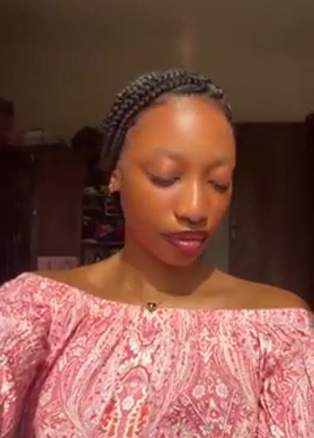 A young woman with brown skin and braided hair sits in a dimly lit room. She wears a pink and white patterned off-the-shoulder blouse and a gold necklace. She is looking at the camera with a slight smile. Behind her is a dark wooden wardrobe.