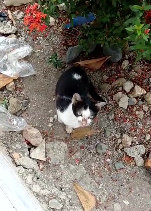 A black and white cat stands on a gravelly surface near a concrete edge and a bush with red flowers. The cat initially looks up at the camera, then turns and sniffs a small branch. There are plastic bags and a small metal container on the ground nearby.