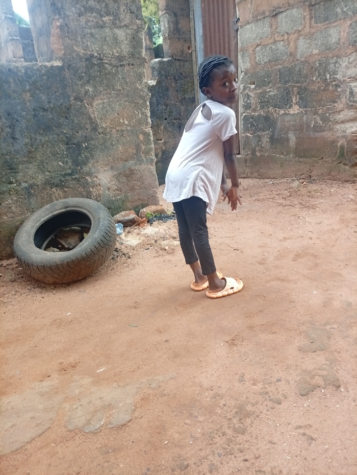 In Nkpor, Nigeria, a young child, appearing female, stands on reddish-brown dirt ground. The child is positioned with her back partially to the camera, looking over her right shoulder, with hands held slightly forward and down. She wears a light-colored, short-sleeved top featuring a cut-out design on the upper back, black full-length leggings, and light orange slide sandals. To the left of the child, a weathered vehicle tire with a visible rim rests on its side on the ground. The background consists of rough, grey concrete block walls, showing signs of wear. A corrugated metal door or gate is visible between sections of the wall in the central background. Sparse green foliage is faintly visible above the distant wall line.