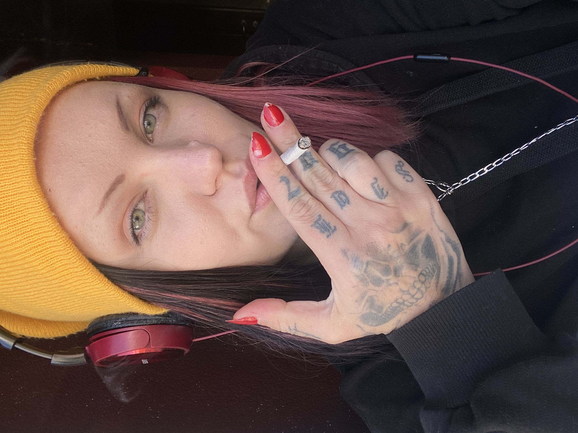 In Kunje, Montenegro, a female subject is depicted in a close-up portrait, looking directly at the camera. She wears a yellow knit beanie and red Sony over-ear headphones, with a wisp of smoke visible near the left headphone cup. Her hair, dark with reddish highlights, is partially visible. Her right hand, adorned with extensive tattoos including a skull design on the back and various symbols on the fingers, holds a lit cigarette between the index and middle fingers. Her fingernails are painted red. Smoke emanates from the cigarette, positioned near her slightly parted lips. She has green eyes and a light complexion. She wears a black long-sleeved garment, likely a hoodie, and a silver-colored chain necklace is visible. The background is dark and out of focus, featuring a reddish-brown surface on the left and a darker, almost black, area on the right.