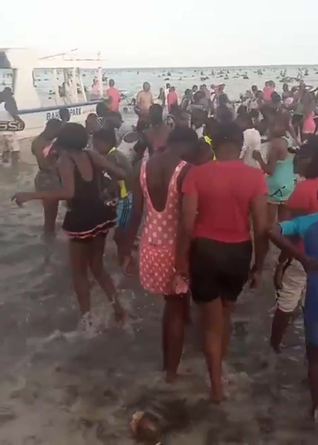 A crowded beach scene features a large group of people wading in shallow water. Most appear to be children and teenagers. They are dressed in various swimsuits and casual clothing. Some are splashing and playing. A white motorboat is partially visible in the background, close to the shoreline. In the distance, the ocean is filled with more people, suggesting a popular beach location. The sky is overcast, and the overall lighting is somewhat muted. The sand is dark.