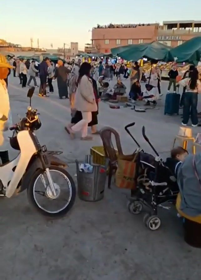 busy market scene, possibly in Morocco. People are walking around, some shopping, others just passing through. There are stalls selling various items, and a few motorbikes are parked nearby. A child is seen sitting on a stool near a stroller, and several people are wearing traditional clothing. The market appears to be outdoors in a large open area. The lighting indicates that it is either early morning or late afternoon. The sky is clear and blue. A multi-story building can be seen in the background.