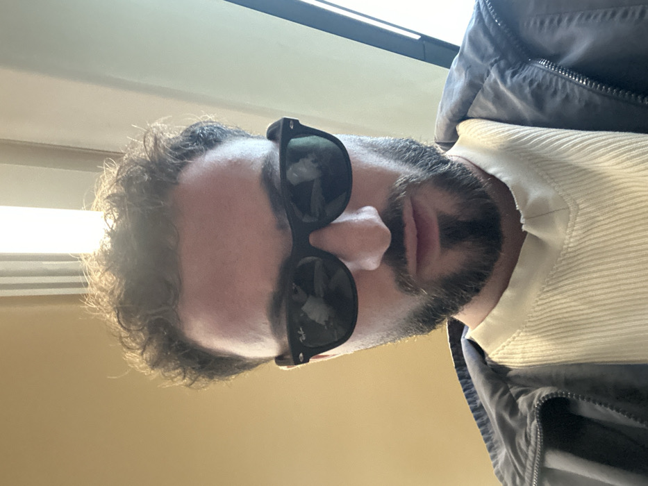 The image depicts a close-up, frontal view of an adult male. He has dark, curly hair and a full beard with a mustache. He is wearing black Ray-Ban Wayfarer-style sunglasses. His attire consists of a light-colored, possibly cream or off-white, ribbed V-neck shirt worn under an open dark gray jacket with a visible zipper on the left side. The individual is looking directly towards the viewer. The background is an indistinct indoor setting. To the left, a plain light-beige wall is visible. To the right, a vertical illuminated light panel or fixture is present, alongside a dark vertical frame, possibly part of a window or doorway. Reflections in the sunglasses suggest an indoor environment with ambient lighting. The specific location within the city of Strasbourg, France, cannot be determined from the visual information provided in the image.