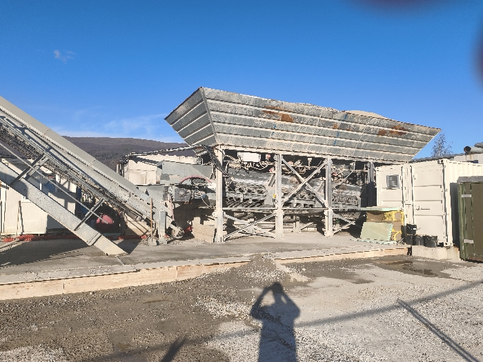 An outdoor industrial site in Pirdop, Bulgaria, is captured under a clear blue sky with a distant mountainous horizon