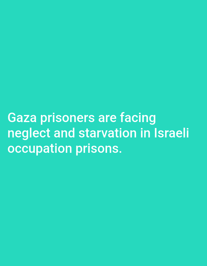 This image is a static graphic displaying white text against a solid teal background. The text reads: "Gaza prisoners are facing neglect and starvation in Israeli occupation prisons." The font is a sans-serif style, centered horizontally and positioned in the lower-middle section of the frame. No people, discernible objects, actions, or specific environmental details of a physical location are depicted. The image is a textual statement and does not illustrate a scene in the city of Khan Yunis, Palestinian Territory, or any other geographical location.