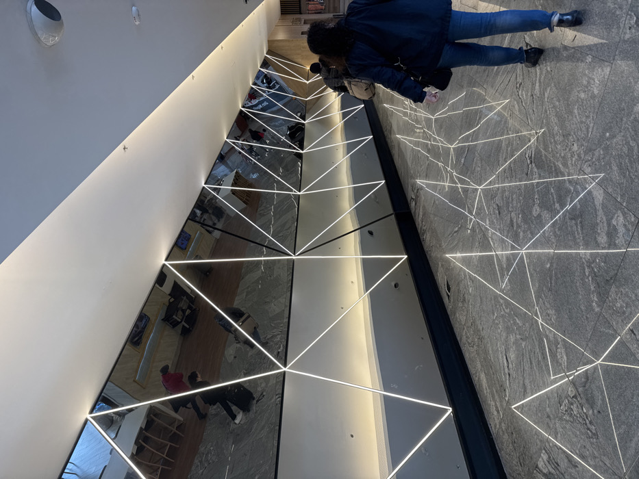 A high-angle shot shows a woman in jeans and a jacket standing on a gray stone floor with a triangular light pattern. Adjacent to the floor is a wall of reflective glass with a similar light pattern. The glass reflects the interior of a store with customers and shelving. The reflective surface creates an interesting visual effect as the two sides mirror each other.