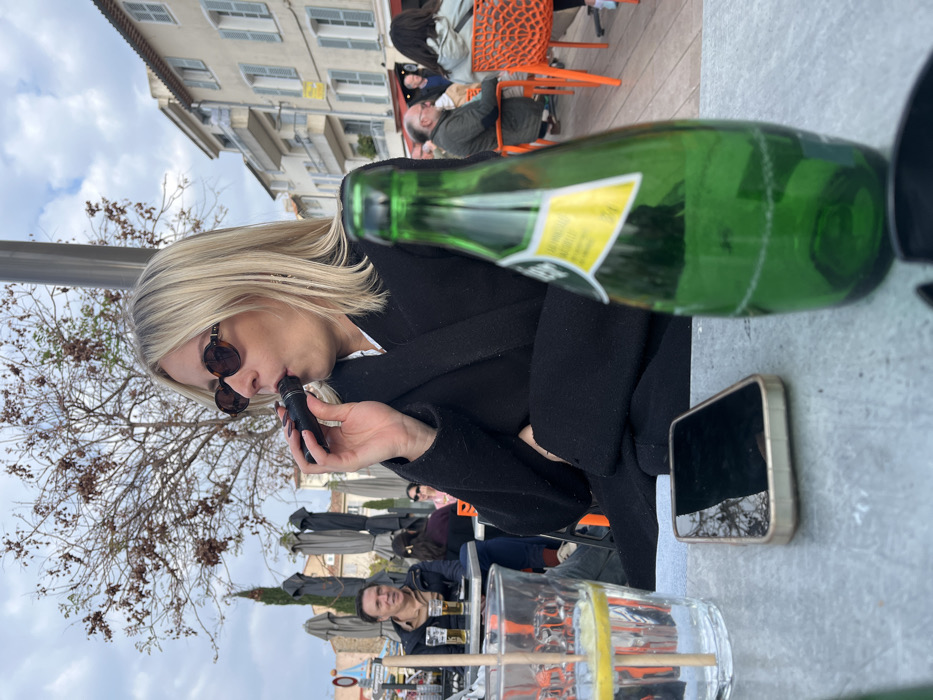 An outdoor cafe scene in Antibes, France, is depicted under a partly cloudy sky. In the foreground, a blonde woman with shoulder-length hair and oval sunglasses is seated at a light grey table, actively inhaling from a black vaping device held to her mouth with her right hand. She wears a black coat over a white collared shirt. On the table, to her left, is a clear glass containing water, a lemon slice, and a light brown straw. Centered on the table is a gold-cased smartphone resting screen-down. To her right, a green glass bottle with a yellow label, appearing to be Perrier, stands partially full. In the midground, behind the woman, other patrons are visible. To her left, a man with brown hair, wearing a beige shirt, smiles while seated at an adjacent table with two glasses of amber liquid. Further back, several dark, folded outdoor umbrellas are present, along with additional indistinct figures seated at tables featuring bright orange chairs. The background reveals a light-colored, multi-story building with light blue shutters on its windows, consistent with local architecture. Bare-branched trees are also visible, suggesting a non-summer season.