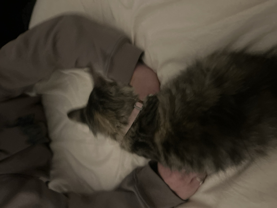 This image depicts a long-haired, multi-colored cat wearing a pink collar, positioned between two human arms. The cat is seen from a slightly elevated angle, with its back facing the viewer and its head turned partially to the right. The human arms are clad in a grey-brown, long-sleeved garment, likely a sweatshirt or similar casual wear. A silver-colored ring is visible on a finger of the left hand. The setting appears to be an indoor environment, likely a bed or soft surface covered with light-colored (white or cream) bedding. The overall lighting is dim. The scene is depicted as being in Squamish, Canada.