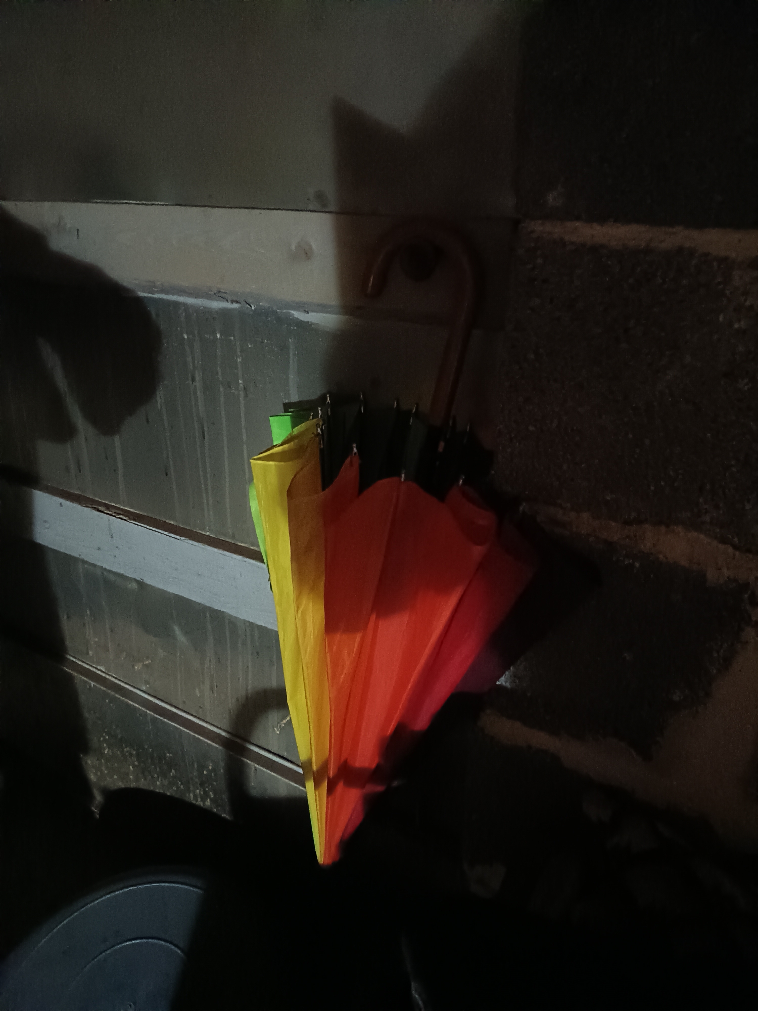 A folded, rainbow-colored umbrella with a curved handle is hanging on a wall. The wall is divided into two sections: one appears to be made of gray metal or wood panels, and the other is made of rough, dark-colored stones or bricks. There are shadows visible on the wall, suggesting a light source from the side or above. The bottom of the image shows a dark, indistinct area with a circular object that could be a bucket or lid. The image appears to be taken in a dimly lit area.