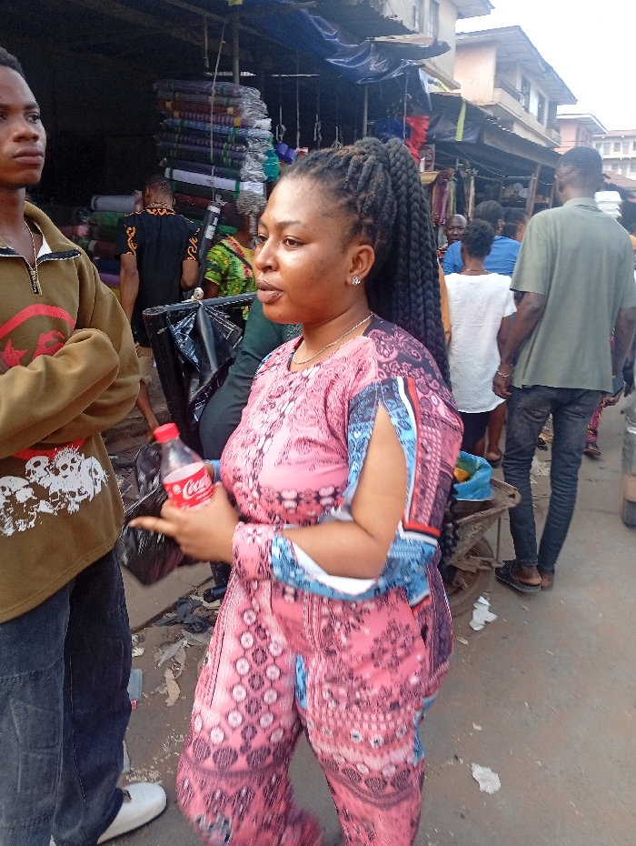 An outdoor market scene in Fegge, Nigeria, depicts a daytime setting with multiple individuals