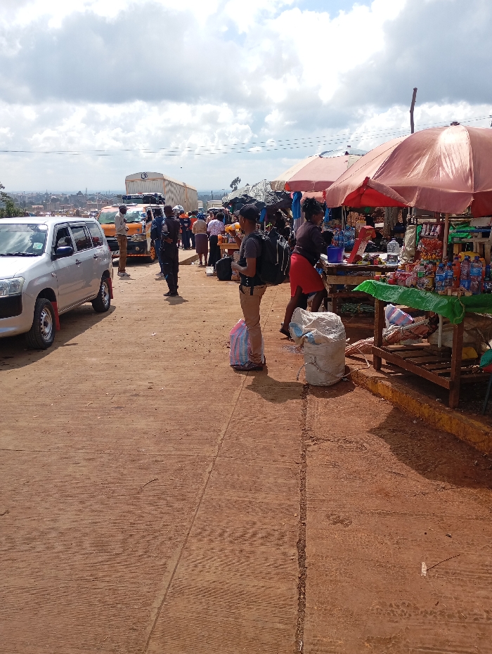 A bustling roadside market scene under a cloudy sky. A silver car and yellow taxi sit adjacent to a road lined with people, some standing near a large white truck. Market stalls with red umbrellas display various goods. A person with a backpack stands near bags, seemingly waiting. Another person in a red skirt is interacting with a vendor at a stall, filled with an assortment of items.