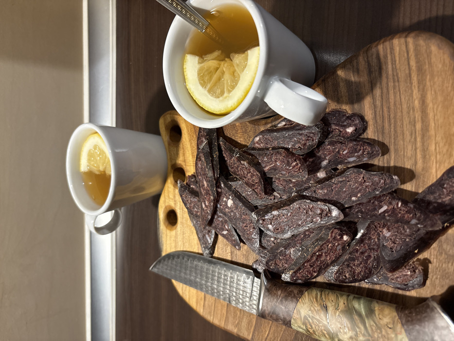 A still-life composition is depicted indoors, located in the city of Ruse, Bulgaria. The central element is a wooden cutting board of irregular, rounded shape. On the left side of the board, a fixed-blade knife rests, featuring a steel blade with a textured pattern, possibly Damascus or hammered, and a handle displaying a variegated pattern of light green, brown, and dark brown tones. Adjacent to the knife, a mound of dark reddish-brown, thinly sliced cured meat or sausage, exhibiting irregular shapes and lighter inclusions, is piled on the board. Two white ceramic mugs are visible. The mug in the foreground, positioned to the lower right, contains a clear, yellow-brown liquid with a circular lemon slice and a silver-colored spoon immersed. A second, identical white ceramic mug is situated behind the cutting board, also holding a clear, yellow-brown liquid and a lemon slice. All objects are arranged on a dark brown surface, identified as a countertop or table, against a light-colored background wall or backsplash. No individuals are present.