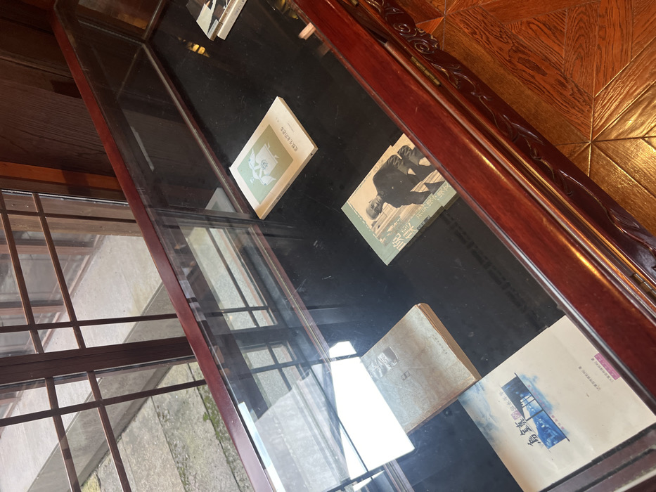 An interior scene in Tongxiang, China, captures a dark wooden display case with a glass top, set against a multi-pane wooden window overlooking an outdoor area. The display case's front border features carved ornamentation. Inside, four books are horizontally arranged on a dark surface. From right to left and top to bottom, these include a light-colored book with a green and white graphic, a light-colored book featuring a black and white photograph of a man in a dark jacket with vertical text, an older, aged brown book, and a white book with a blue and white graphic of a building over water. The glass top reflects the interior, causing some visual obstruction. Outside the window, a paved courtyard with visible moss is present, along with another structure featuring similar wooden window frames. The interior floor in the bottom right is patterned with polished wooden planks.