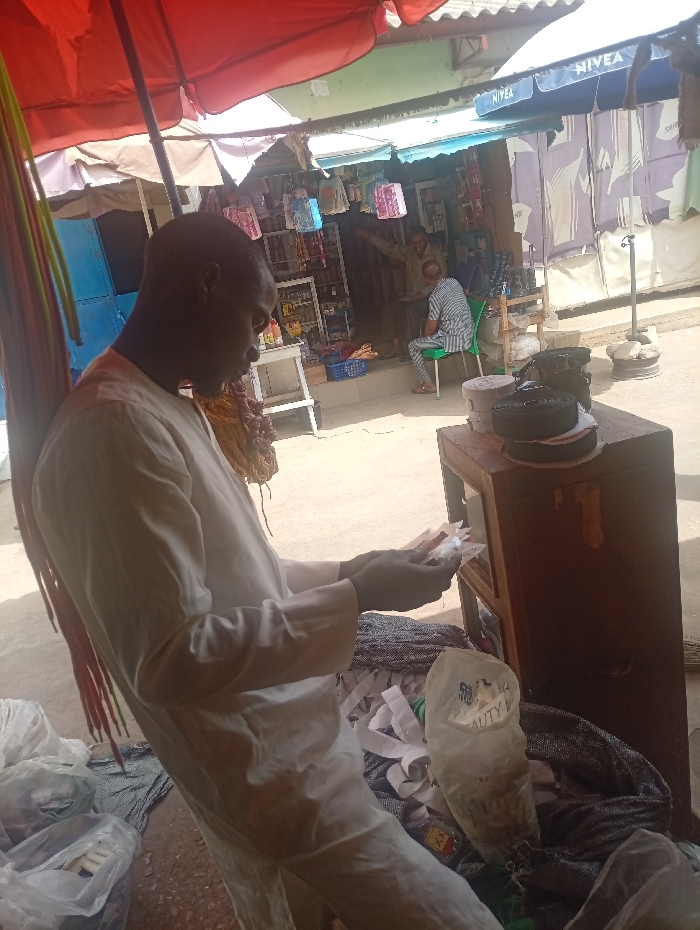 The scene depicts an outdoor market in Maiburiji, Nigeria, under daylight conditions. In the foreground, a male individual, dressed in a light-colored long tunic, is seated and engaged in counting a stack of small, light-colored rectangular papers, likely currency, with his hands which appear darkened. To his immediate left, multiple strands of red, green, and yellow cords hang vertically from an overhead red awning. Adjacent to the individual, on a wooden cabinet, several dark, round objects, resembling caps or hats, are stacked. The ground below him contains various merchandise, including a clear plastic bag labeled "BEAUTY WORLD" filled with small items and loose white fabric strips. In the midground, an open market stall is visible, displaying hanging merchandise. Inside this stall, a male individual stands, extending his right arm. To the right of the stall, another male individual is seated on a green plastic chair, wearing a striped shirt and light-colored pants. Overhead, a large white umbrella with "NIVEA" branding in blue provides shade. The ground surface appears to be unpaved earth or rough concrete.
