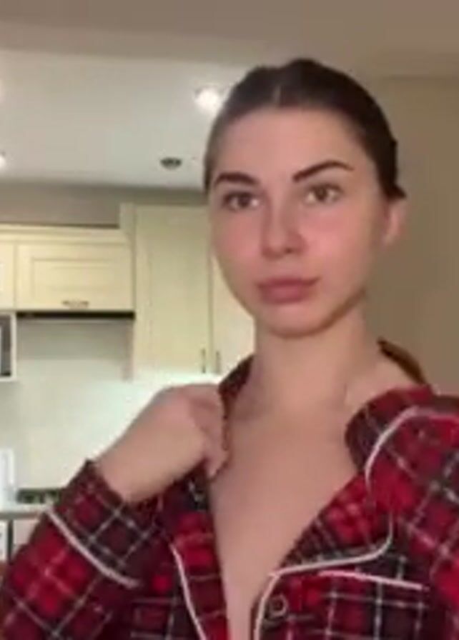 A young woman in red-and-black flannel pajamas stands in what appears to be her living room, with a kitchen visible in the background. Her hair is initially down, but she puts it up in a bun on the back of her head. She has a neutral expression. There is a microwave, a stove, and cabinets in the kitchen. A painting hangs on the wall behind her. She holds her hands in front of her, palms together, as if in prayer, and then moves them to the side.