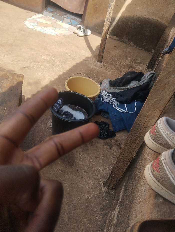 The image depicts an outdoor domestic scene in Unguwan Rimi, Nigeria. In the immediate foreground, a dark-skinned hand is visible, forming a "V" gesture with the index and middle fingers extended. The ground is an uneven surface of packed earth or concrete. In the midground, a black plastic bucket contains water and what appears to be laundry, evidenced by white foam and dark fabric. Adjacent to it, an empty yellow plastic bucket rests on the ground. A pile of diverse clothing, including dark fabrics, a patterned scarf, and blue denim, lies beside the buckets. To the right, a weathered wooden plank diagonally crosses the frame, partially obscuring two light-colored sneakers with a distinct patterned texture and red accents. In the background, a light-colored wall with a mosaic-tiled section on the ground is visible, near which a pair of white slip-on shoes are placed. A rough wooden post supports an unseen structure to the right, against a textured, discolored wall.
