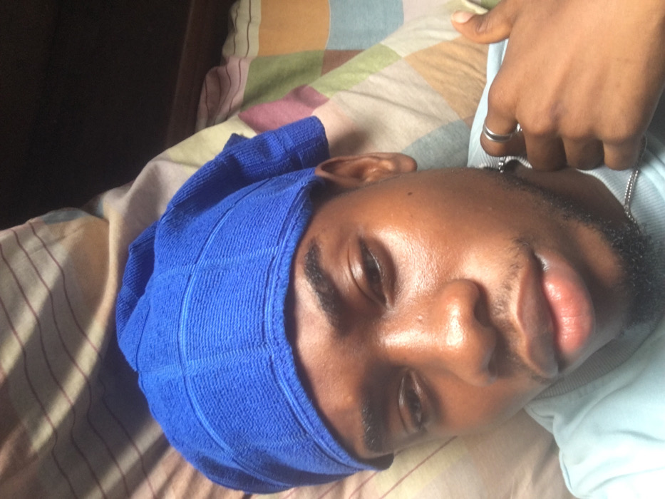 The image displays a close-up, eye-level portrait of a dark-skinned male, positioned as if reclining, likely in Iranla, Nigeria
