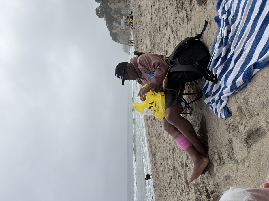 The image displays a sandy beach scene in Malibu, United States of America, under an overcast sky. In the mid-ground, a dark-skinned man is seated in a portable dark-colored beach chair, facing slightly to the right. He wears a black baseball cap with a white emblem, dark sunglasses, a reddish-brown hooded sweatshirt, and dark shorts. A pink compression wrap is visible on his left calf; both feet are bare. He holds a bright yellow plastic bag, marked with "rina" and "LA," and appears to be unwrapping or preparing to eat something from its contents. A black backpack rests on the sand behind his chair. In the lower right foreground, a blue and white striped towel is spread on the sand. To the left, near the waterline, a dark-colored dog stands facing the ocean waves. The background features the Pacific Ocean with moderate waves breaking on the shore. Further to the right, a vegetated rocky cliff rises, with several indistinct figures and a striped beach umbrella visible at its base. A partial view of a leg is visible in the extreme lower-left corner.