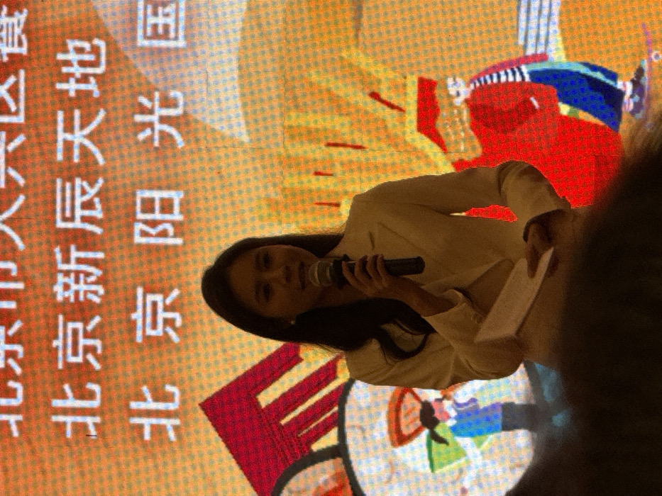 An indoor, medium-shot photograph depicts a female speaker presenting in Daxing District, Beijing, China