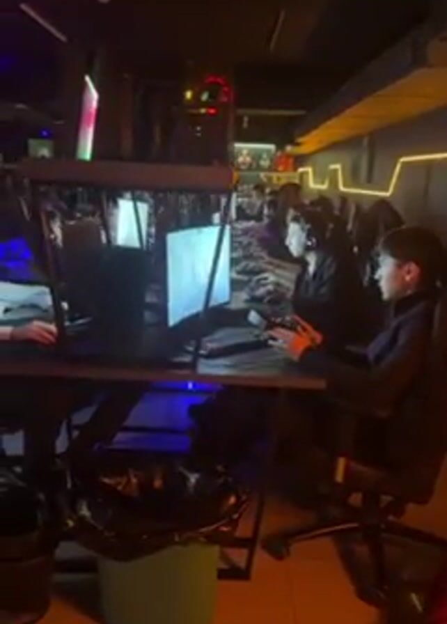 interior of a gaming center. Several people are sitting at desks, using computers, with gaming headsets on. The room is dimly lit with a combination of blue, red, and yellow lighting. Each desk has a computer with a monitor, keyboard, and mouse. There are gaming chairs at each station. There is a trash can near the front of the video. Shelves of what appear to be liquor bottles are visible in the background. Some of the computers have lights inside.