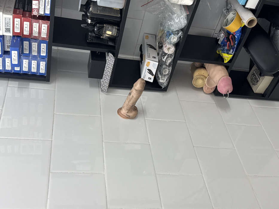 The image depicts an indoor scene within a commercial establishment in Saratov, Russia, showing a white tiled wall and a black multi-tiered shelving unit. On the left, a skin-toned dildo is mounted horizontally on the white tiled wall, protruding into the room. The black shelving unit on the right displays various objects: The top shelf contains stacks of small, rectangular boxes, primarily blue and some red, consistent with medical or tattoo cartridges. The second shelf from the top holds a black box on a patterned surface, several dark-colored bottles, and a white bottle. The third shelf features a white box labeled "BLACK GLOVES NITRILE," clear plastic bags containing rolls of material, and a partially visible, upward-pointing, skin-toned dildo. The bottom shelf displays a pink-tipped, skin-toned dildo with a metal ring at its base, several round beige objects, a roll of yellow tape, miscellaneous items in plastic bags, a light brown box labeled "BURLAK," and a black object at the bottom. No individuals are present, and no actions are depicted.