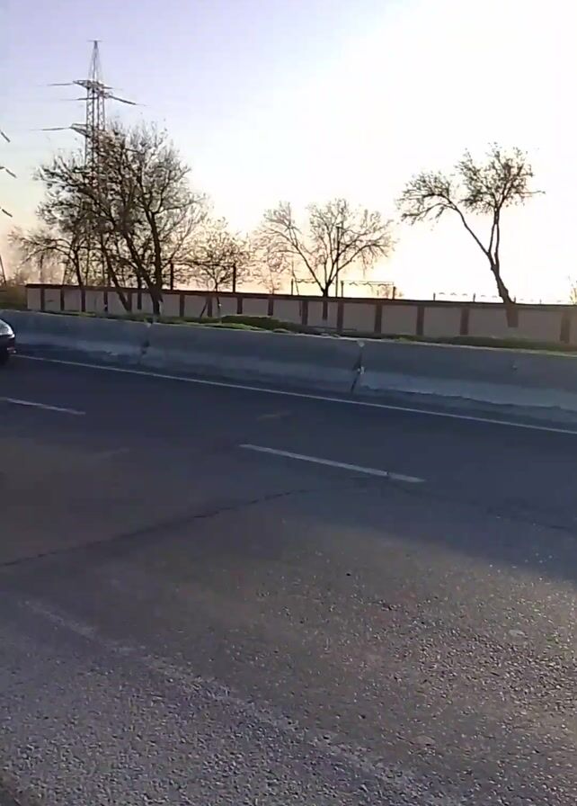 The video depicts a road scene at what appears to be dusk or dawn. The sky is light, with the sun low on the horizon, partially obscured by trees. The road is asphalt, and there is a concrete barrier on the side closest to the camera. Trees with bare branches line the other side of the road, along with a wall. Power lines and towers are visible in the background. A dark-colored sedan drives past the camera, followed by a large white dump truck.