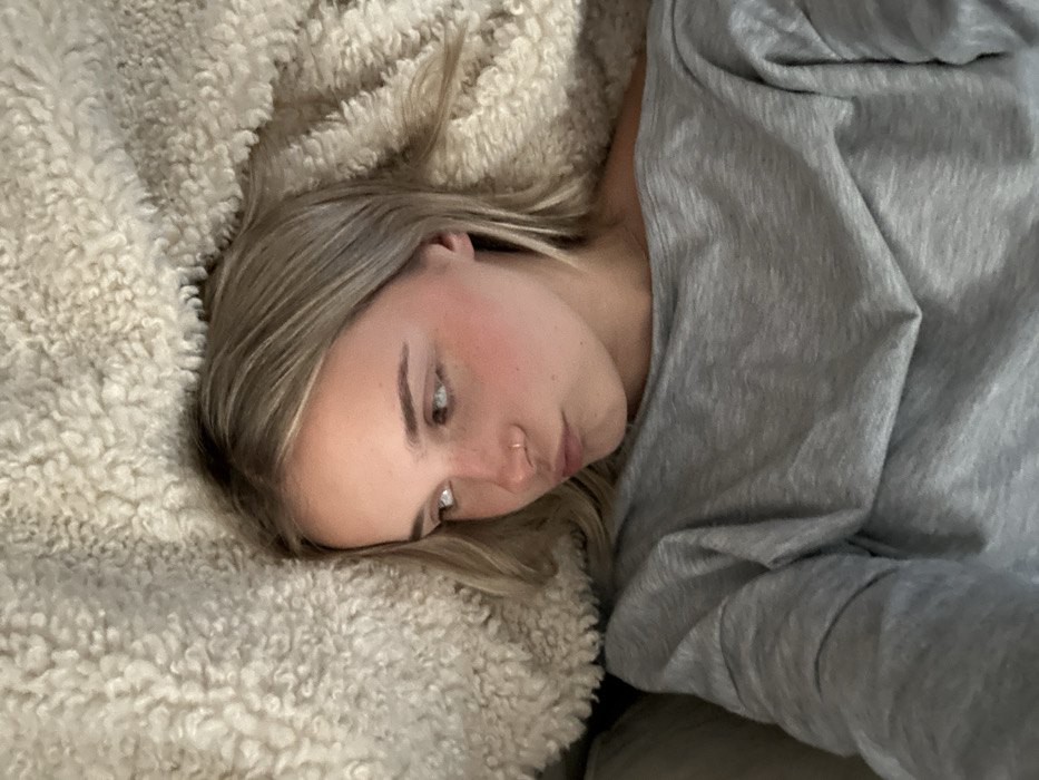 The image depicts a young Caucasian female lying supine in an indoor setting in Kingston, Canada. Her head rests on a textured, off-white fleece or sheepskin-like surface, which occupies the upper half of the frame. She has blonde hair and is wearing a plain grey, long-sleeved top with a wide neckline. A small metallic ring is visible piercing her left nostril. Her light-colored eyes are directed upwards and to her left, away from the camera's axis. Her lips are slightly pursed. The perspective is a close-up, looking down on the individual. A dark, undefined surface is partially visible along the lower-left periphery of the image.