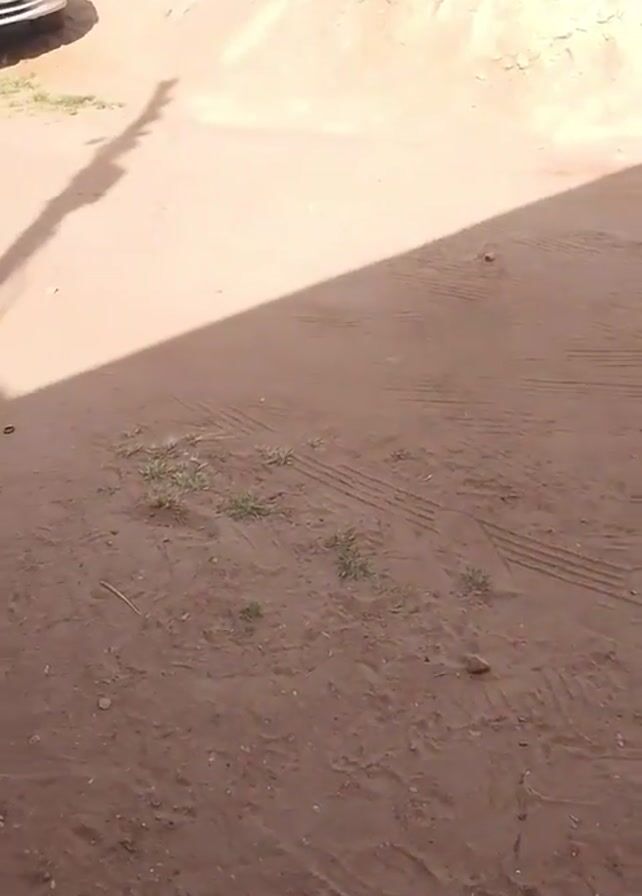 The camera pans around an area with dirt and tire tracks. In the background is a silver car and a mound of dirt. Two people walk into the frame. A man is holding a bag of cement. Two pairs of black Crocs are on the ground.