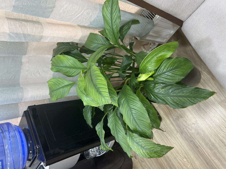 This image presents an indoor scene located in Namangan City, Uzbekistan. In the central foreground, a large potted Peace Lily (Spathiphyllum) plant displays numerous vibrant green, oblong leaves, some exhibiting subtle yellowish striations, and one nascent white spathe emerging near the bottom center. The plant rests on a light-colored wooden or laminate floor. To the immediate left background, a black water cooler unit with a large inverted blue water bottle on top is visible. A clear drinking glass stands on the dispenser's drip tray. The right side of the background features floor-to-ceiling curtains patterned with alternating horizontal bands of light blue/grey and off-white. A section of a light-colored upholstered armchair with a visible brown armrest is positioned in the bottom right corner. A white radiator is partially visible behind the plant and curtains in the mid-right background. No individuals or active interactions are present in the scene.