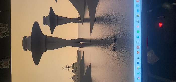 The image is a photograph of a vertical computer monitor displaying a digital artwork depicting a surreal, desolate scene. The lower portion of the monitor shows its operating system's taskbar with various application icons. The digital artwork features a vast body of dark, reflective water under a pale orange-yellow sky. Prominently in the middle ground, two large, dark grey, abstract structures with wide, flared tops and thin, crossed leg-like bases stand in the water. The structure on the left is larger and closer to the viewer. To the far left, a grey military-style warship, resembling a destroyer or frigate, is partially visible, appearing to float on the water. Several dark grey, angular landmasses or small islands rise from the water, particularly towards the right side. In the immediate foreground, a light-colored, human-like head or sculpture is partially submerged face-down in the water. No living individuals are depicted within the digital scene. Above the monitor, a dark horizontal surface exhibits faint, indistinct light-colored markings or stickers. Below the monitor, a dark surface, presumably a desk, features a single illuminated red indicator light. The depicted scene within the digital artwork is not a real-world location and therefore cannot be situated in the city of Abuja, Nigeria. The photograph itself may have been taken in Abuja, but the artistic content is non-geographical.