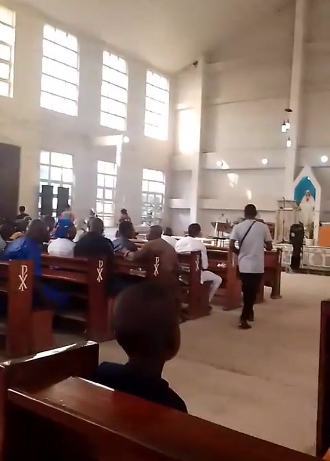 interior of a church with rows of wooden pews. Some people are seated in the pews, while others are standing and walking around. One person in a white shirt is walking towards the altar area. A woman in a patterned purple and white dress is leaning over a pew, possibly talking to someone. The walls of the church are white, with several windows letting in natural light. There are a few light fixtures hanging from the ceiling. The altar area is visible in the distance, decorated with white and light blue elements. The overall atmosphere appears calm.