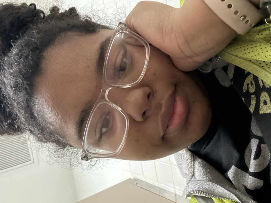 A close-up, rotated selfie featuring a young woman with clear-framed glasses. She has dark, curly hair pulled back and is wearing a light pink smartwatch. Her skin is brown and slightly freckled. She rests her cheek on her hand, which also reveals a small earring. She wears a black shirt with yellow and white designs, partially covered by a gray zippered hoodie and a neon green jacket. A white wall is visible in the background.