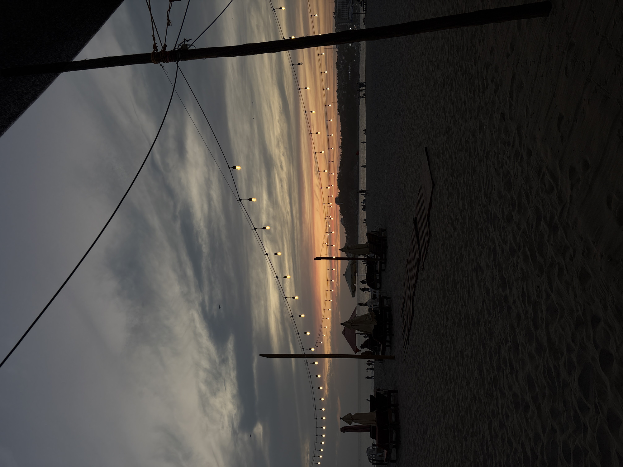A view of the beach at Brisas de Zicatela, Mexico, taken at dusk, is presented in a slightly tilted orientation. The sky displays shades of gray and peach, and strands of lights hang above the scene. Silhouetted figures are visible on the beach, along with beach umbrellas and lounge chairs. A wooden pole and thatched roofing are partially visible in the frame. The beach sand is dark.