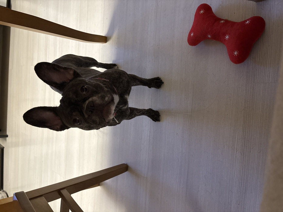 - "An indoor scene in Pleven, Bulgaria, depicts a brindle French Bulldog standing on a light-colored laminate floor, facing directly towards the camera" by FM-QTuom1, licensed under CC BY 4.0