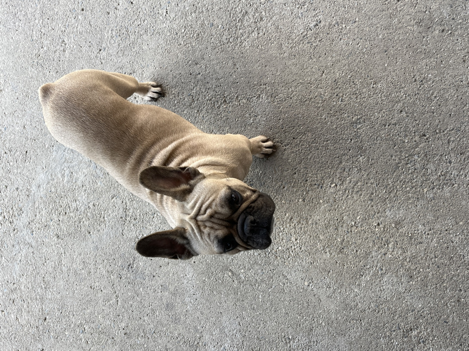- "A fawn-colored French Bulldog stands on a coarse, light gray asphalt or concrete surface" by FM-yO5cv1, licensed under CC BY 4.0
