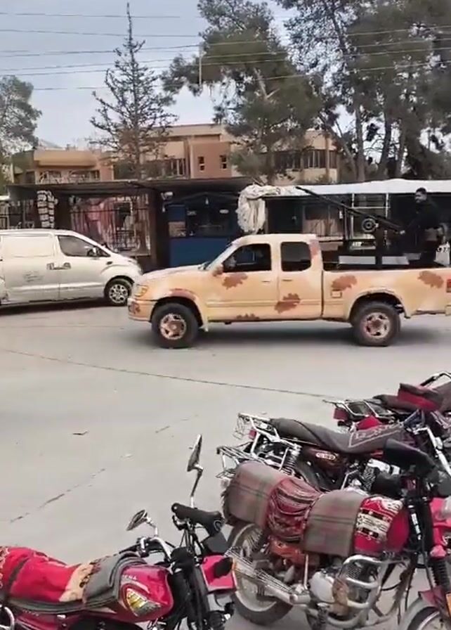 The scene captures a public space on what appears to be an overcast day. Several motorcycles are parked close to the camera. A tan pickup truck with a camouflage pattern drives across the frame. At least two individuals are visible in the back of the truck. One of them is operating what looks like a heavy weapon mounted in the truck bed. People are seen walking on the street, appearing to pay little attention to the truck. Buildings and trees form the backdrop of the scene. The general environment suggests a location that is potentially experiencing conflict or instability.