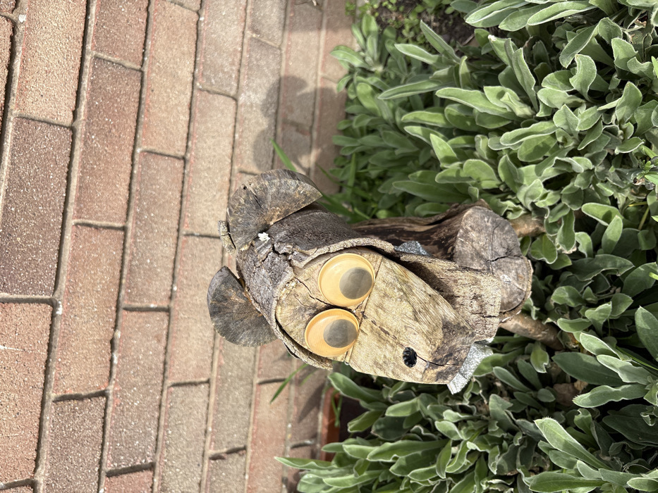 A handcrafted wooden garden ornament, resembling a stylized animal, is situated outdoors in Minsterley, United Kingdom. The ornament is constructed from weathered, light-brown wood, exhibiting visible cracks and grain. It features a head with two prominent orange-yellow plastic googly eyes and two semi-circular wooden ears. A small, dark circular indentation is present on the snout area, with a textured, silvery-gray metallic or fabric element affixed beneath it, functioning as a collar. The ornament stands amidst a dense bed of low-lying green foliage, characterized by light-colored, possibly fuzzy, leaves. In the background, a reddish-brown brick wall is visible, constructed with a stretcher bond pattern. Direct sunlight illuminates the scene, casting distinct shadows on both the wall and the surrounding vegetation. No human subjects are present.