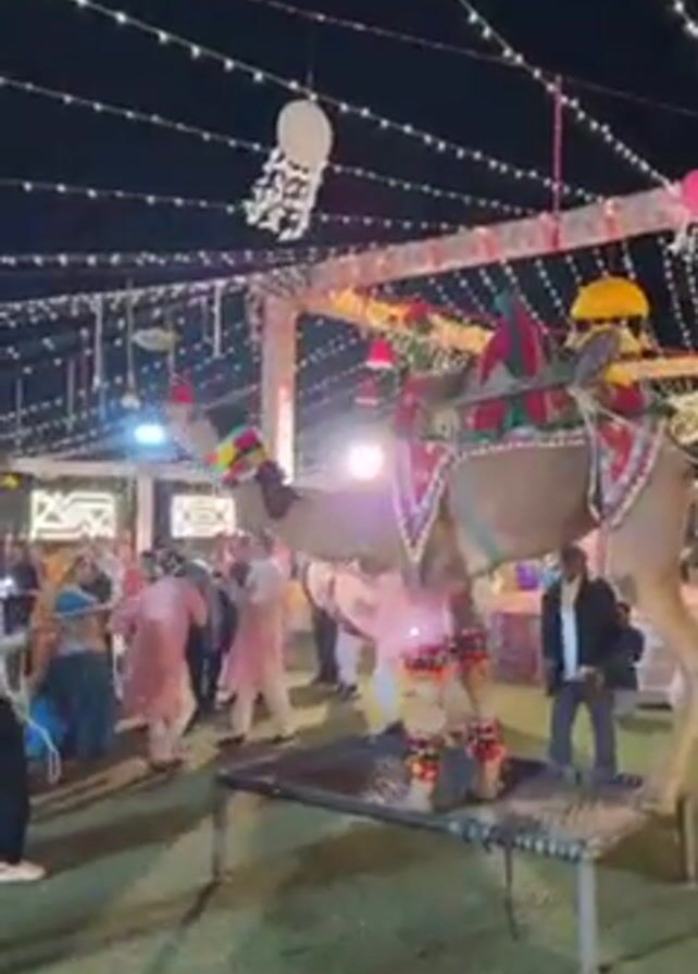 At an outdoor evening event, a decorated camel stands on a metal cot surrounded by people. The camel is adorned with colorful fabric and tassels, and a small yellow umbrella is attached to its saddle. Some individuals are dressed in traditional Indian attire, while others wear casual Western clothing. The setting is decorated with string lights, hanging white ornaments, and colorful fabrics stretched overhead. People mill around, some dancing, seemingly enjoying the festivities. The ground appears to be artificial turf. A camera operator is present, filming the scene.