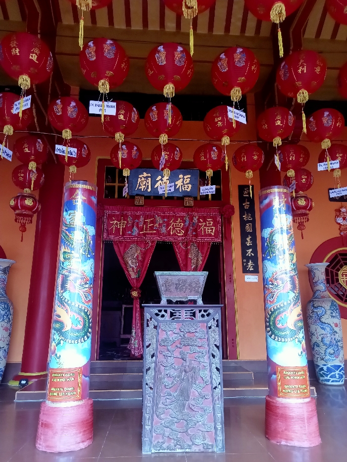 An ornate Chinese temple exterior, adorned with numerous red lanterns dangling overhead and labeled with various names. The entrance is flanked by red pillars and decorative vases. A prominent sign displays Chinese characters, with a smaller sign below it in Latin characters. The pillars are decorated with dragon motifs and inscriptions. A carved wooden stand sits in front of the entrance, adding to the temple's intricate and vibrant aesthetic.