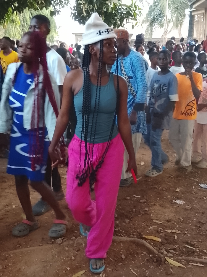A woman in a white hat adorned with dark crosses, a gray tank top, and bright pink pants walks among a crowd. She has long braids, some hanging to her hips. She holds a red object in her right hand. The surrounding people are dressed in a variety of casual clothing, and the ground appears to be dirt. A fallen tree branch and litter are visible at the bottom of the image.