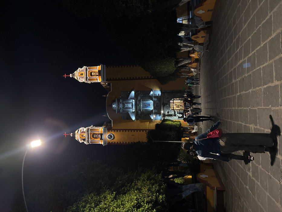 - "Illuminated at night, a yellow church with two bell towers topped with red crosses dominates the scene" by FM-H12MK2, licensed under CC BY 4.0