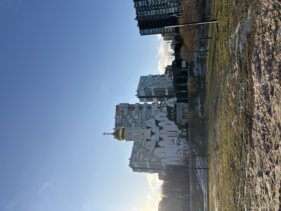 The image displays the Church of John the Theologian in Kudrovo, Russia, viewed from a slightly elevated, unpaved foreground. The large, white-plastered Orthodox church, featuring multiple cupolas and a prominent golden dome surmounted by an Orthodox cross, stands in the midground. The golden dome exhibits significant sun glare from the left. Immediately behind and to the right of the church, multiple high-rise residential buildings with diverse architectural designs and colored panels (red, green, blue, dark grey) dominate the skyline. The foreground consists of a broad, uneven grassy area with visible patches of dirty snow and exposed soil. A narrow body of water, likely a river or canal, runs horizontally across the midground, separating the foreground from the church complex. Small, deciduous trees with bare branches line the water's edge. Approximately a dozen dark-plumaged waterfowl are observed on or near the water. The sky is clear and blue, with low sunlight suggesting either morning or late afternoon. No individuals are visible.