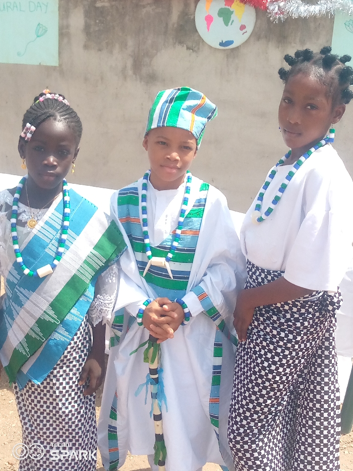 Three children stand in front of a light grey concrete wall, decorated with a globe and a sign that reads "CULTURAL DAY," seemingly in Ajaokuta, Nigeria. The child in the center wears a white outfit with a green and blue striped hat and sash, holding a decorated staff. The children on either side wear patterned cloth wraps and matching necklaces. The child on the left has beaded hair and earrings, while the child on the right has braided hair and matching earrings.