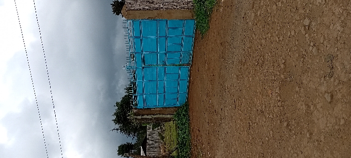 The image displays an outdoor scene in Gatakaine, Kenya, featuring a closed, double-leaf metal gate under an overcast sky