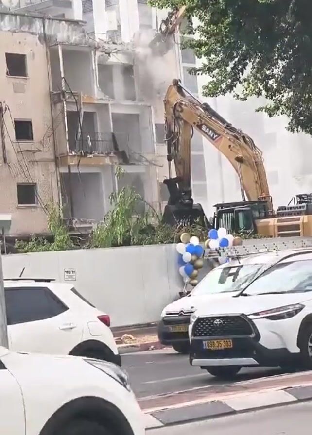 A building demolition is underway. An excavator is dismantling the building, with debris falling as it works. The site is partially obscured by a white wall, behind which a couple of balloon bouquets in blue and gold stand. Several parked cars are visible on the street, including white vehicles. The building being demolished appears to be an older, multi-story structure. Dust and debris fill the air around the demolition site. Trees provide some foliage along the side of the scene, and a taller, more modern building is visible in the background.